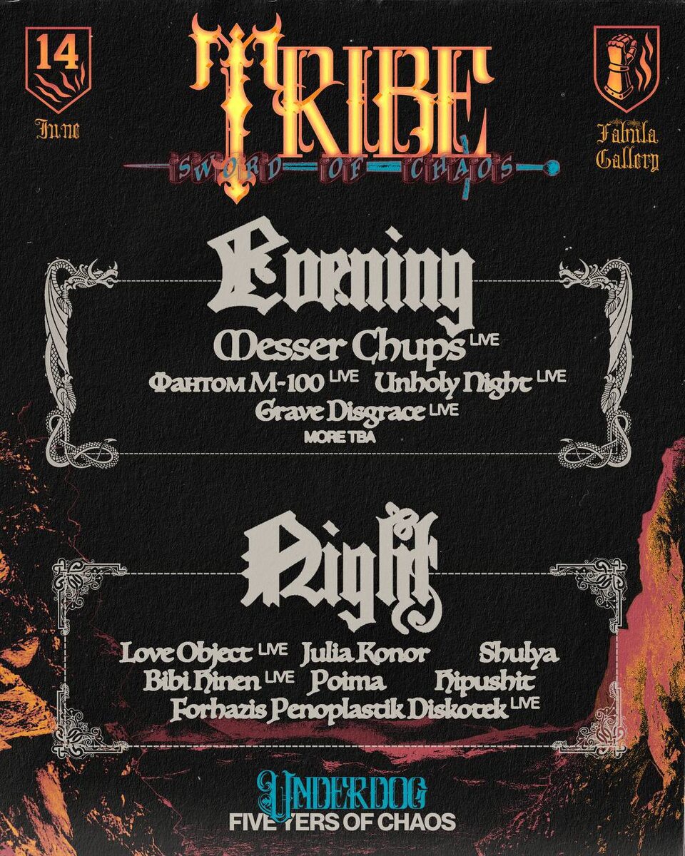 Tribe Festival 14 июня на один вечер в город вернется фестиваль Tribe, чтобы снова показать разнообразие подземельной музыки, собрать воедино всех самых близких по духу представителей разных жанров и, наверное, самое главное, отметить пятилетие Underdog. Dungeon Synth – тематика года, которую поддержат и лайн-апом и оформлением. Нас ждет погружение в таинственный, фэнтезийный мир — место приключений, магии и мистики. На этот раз у «Трайба» будет вечерняя и ночная программа. Вечером – гитарная сцена во дворе завода «Кристалл», ночью – вечеринка в fabula. LINE UP: Вечер (двор Кристалла) Фантом М-100 (live) Unholy Night (live) Grave Disgrace (live) Messer Chups (live) UNLIFE (live) МС Штучка и Даха555 (live) Ночь (Fabula Hq) Love Object (live) Julia Konor Shulya Bibi Hinen (live) Poima Hipushit Forhazis Penoplastik Diskotek (live) 🎫 Билеты 📆 14 июня, с 18:00 📍Fābula Hq, Москва, Самокатная ул. 4с1