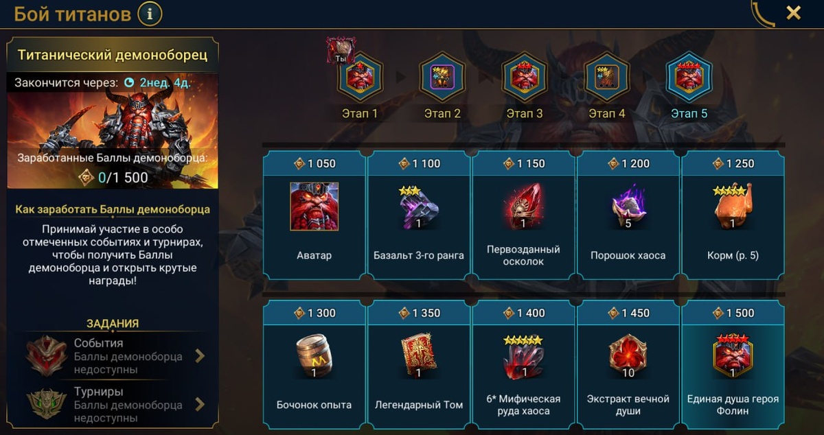 Запустили Титаническое Событие, в котором можно будет забрать души на Фолина Рыжеборода, новые реликвии, аватар и другие ресурсы. - Событие пройдёт с 13 июня(пятница) до 1 июля(вторник) - В ходе мероприятия Титанического События вы сможете заработать до 1050 баллов в первой части события ( с 13 июня по 22 июня) - И до 700 Балов Титана во второй части ( с 23 июня по 1 июля) Вы можете заработать всего до 1750 Балов Титана, но вам понадобится всего 1500 Баллов, чтобы разблокировать все награды.