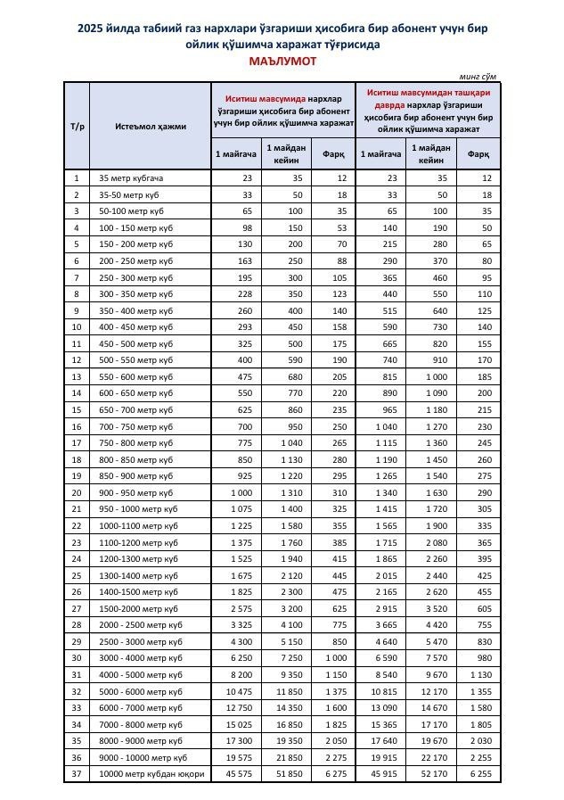 2025 йилда табиий газ нархлари ўзгариши ҳисобига бир абонент учун бир ойлик қўшимча харажат ҳақида ҳам шуни айтиш мумкин. Аммо электр энергиясидаги ўзгаришдан фарқли равишда, табиий газ нархи барқарор ўсган. Хусусан, иситиш мавсумидан ташқари даврда 100 метр куб табиий газ сарфлаган аҳоли хонадони бунинг учун аввалгидек 65 минг сўм эмас, балки 100 минг сўм тўлаши керак бўлади. Яъни, харажат 35 минг сўмга ошяпти. Аммо бошқа томондан қаралса, нарх ошиши у қадар сезиларли эмас. Масалан, аҳолининг 70 фоизидан зиёди истеъмол қиладиган 100 метр куб газ учун қўшимча 35 минг сўм, кунлик ҳисоблаганда эса, суткасига 1167 сўм ортиқча харажат қилинади. Сизга қулайлик яратиш мақсадида тайёрланган мазкур жадвал нарх ўзгаришларини аниқ билиб олишингизга хизмат қилади. Манба: Иқтисодиёт ва молия вазирлиги. Каналимизга обуна бўлинг ва энг сўнгги янгиликларни кузатиб боринг Jizzaxnews |Тelegram | Facebook | Dzen | YouTubе