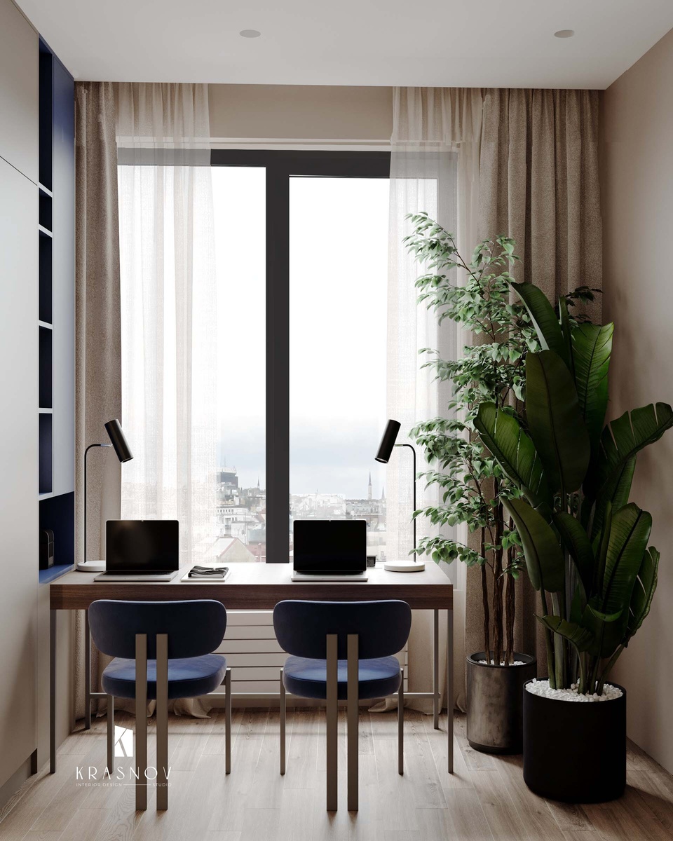 Когда мы говорим о современном интерьере, особенно если это интерьер квартиры с рабочей зоной, всё чаще на первый план выходит не визуальный эффект, а ощущение комфорта, ясности и логики. Хорошо спроектированный интерьер не отвлекает. Он помогает сосредоточиться, работать, отдыхать — и делает это незаметно, без давления и лишних деталей. Планировка — это основа. Но не просто «кухня-кабинет-спальня». Важно понимать каждую функцию: что и где будет лежать, как именно используется мебель, где проходит свет и как работает сценарий жизни. В этом проекте мы пошли от сценария: не от визуальных референсов, а от образа жизни клиента. Через точный подбор материалов и элементов вышли на мягкий современный минимализм. Он сдержан, но не холоден. Здесь нет «декора ради декора». Только живые текстуры, только то, что работает. Центральное пространство — кабинет. Именно в нём сошлись все ключевые задачи: Что важно для комфортной работы вдвоём? Не мешать друг другу. Поэтому рабочие места — не «лицом к ли