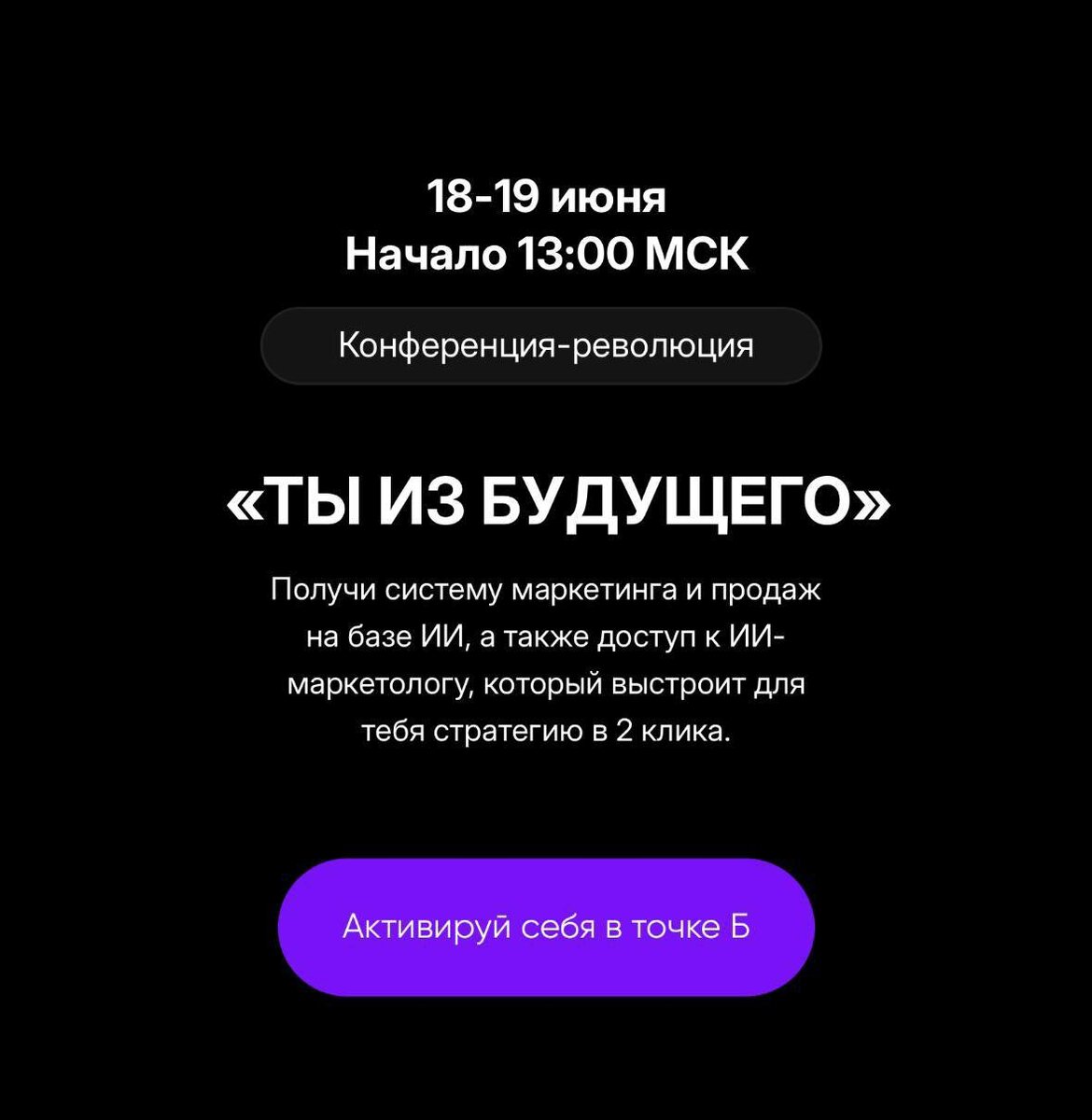 💥 Через 2 дня вы будете делать с ИИ больше, чем целая команда за месяц 🗓 18–19 июня 🕐 13:00 МСК 💻 Онлайн 🎟 Бесплатное участие Я буду выступать на мощной конференции про нейросети и маркетинг «ТЫ ИЗ БУДУЩЕГО» И не просто рассказывать — я в прямом эфире создам трёх ИИ-помощников под задачи продаж, контента и автоматизации. Вы сможете адаптировать их под себя — хоть вы эксперт, хоть новичок. 🔥 Кроме меня — ещё 12 спикеров, которые каждый день зарабатывают с ИИ и покажут, как это делается по-настоящему: — как сократить стоимость лида на 50% — как заменить копирайтера и маркетолога — как продавать, даже когда вы спите — и как всё это применить к вашему бизнесу, а не в теории 🎁 Бонусы для участников: ✔️ Участие бесплатно ✔️ Грант на 100 000 ₽ ✔️ ИИ-маркетолог в подарок ✔️ Закрытый чат (доступ навсегда) ✔️ Подарки от партнёров Пропустить — значит остаться в прошлом. ⚠️ Всё будет вживую. Всё можно внедрить сразу. Быть всем! Обязательно. 👇 Заберите своё место: 🔗 ЗАБРАТЬ МЕСТО