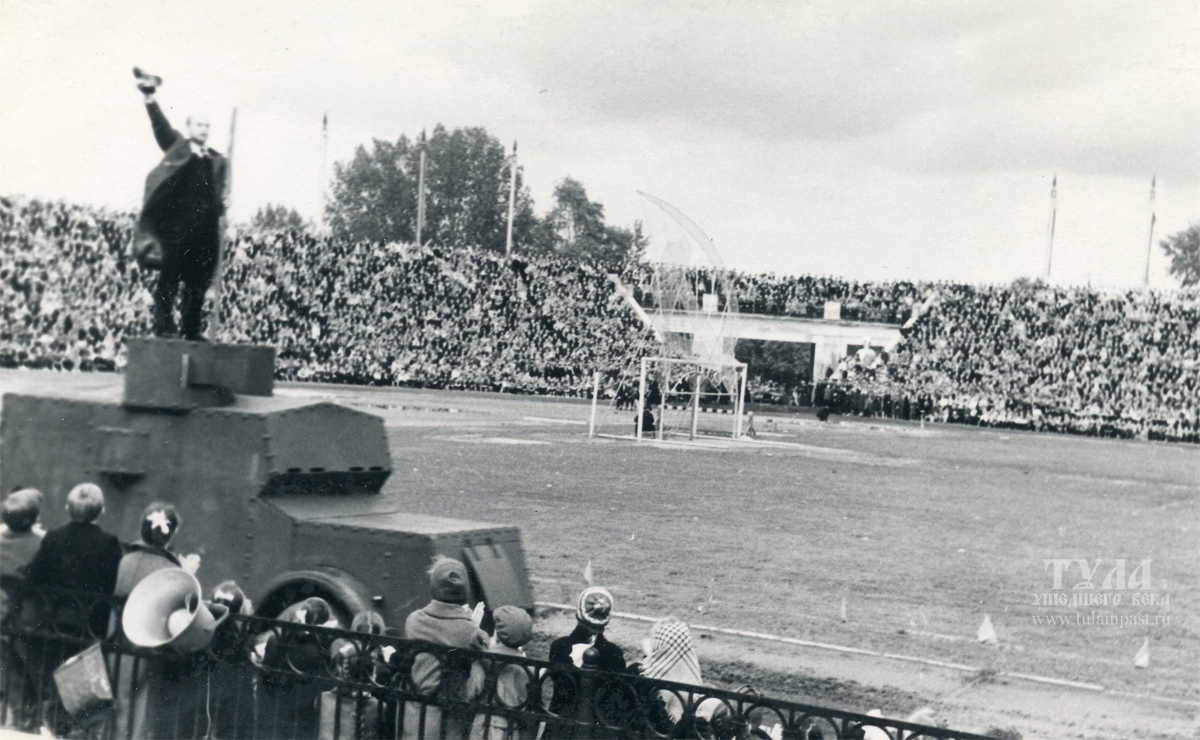 1. Ленин на броневике. 2. Буржуи в повозке. 3. Лачуги бедняков, угнетаемых вышеуказанными буржуями. 4. Тульские мастера, кующие "блох" прямо на повозке. Надо отметить, что тулякам подобные мероприятия нравились - на трибунах яблоку было не упасть. Во время праздников на площади стадиона устраивались ярмарки, разбивались шатры со снедью и напитками. К тому времени телевидение еще не вошло в каждый дом и люди ходили на представления как на редкое и захватывающее развлечение. Канал "ПАНТОГРАФ". Материал предоставлен проектом "Тула ушедш