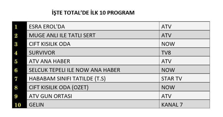 🔥 Всё только начинается! Рейтинговые войны на турецком телевидении разгораются с новой силой, и редакция сайта cheek-look.ru спешит раскрыть все карты. Кто забрал золото, а кто остался за чертой тройки лидеров? Давайте разберёмся! 📊 В общей аудитории (Total) безоговорочную победу одержало шоу Esra Erol’da — и это уже стало доброй традицией! На втором месте — Müge Anlı ile Tatlı Sert от Atv, а бронза досталась драме Çift Kişilik Oda. Интересно, сможет ли кто-то сместить фаворитов в ближайшие недели? 🕵️♀️ Здесь царствует Müge Anlı ile Tatlı Sert — программа, которая не первый год держит зрителей в напряжении. Вторую строчку неожиданно занял Survivor 2025 All Star – Gönüllüler, доказав, что зрители всё ещё обожают испытания на выживание. А вот Çift Kişilik Oda замкнул тройку, но разрыв минимальный — всё может измениться в любой момент! 🎭 Картина почти повторяется: Müge Anlı ile Tatlı Sert снова на вершине, за ним следует Çift Kişilik Oda, а Survivor опустился на третью позицию. Но чт