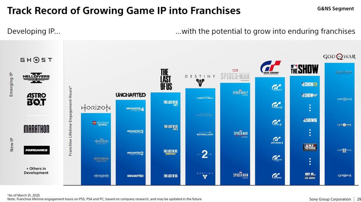 God of War — самая популярная франшиза PlayStation по вовлечённости игроков (в часах). 1. God of War 2. MLB The Show 3. Gran Turismo 4. «Человек-паук» 5. Destiny 6. The Last of Us 7. Uncharted 8. Horizon. В подсчётах учитывают только игроков на PS5, PS4 и ПК.
