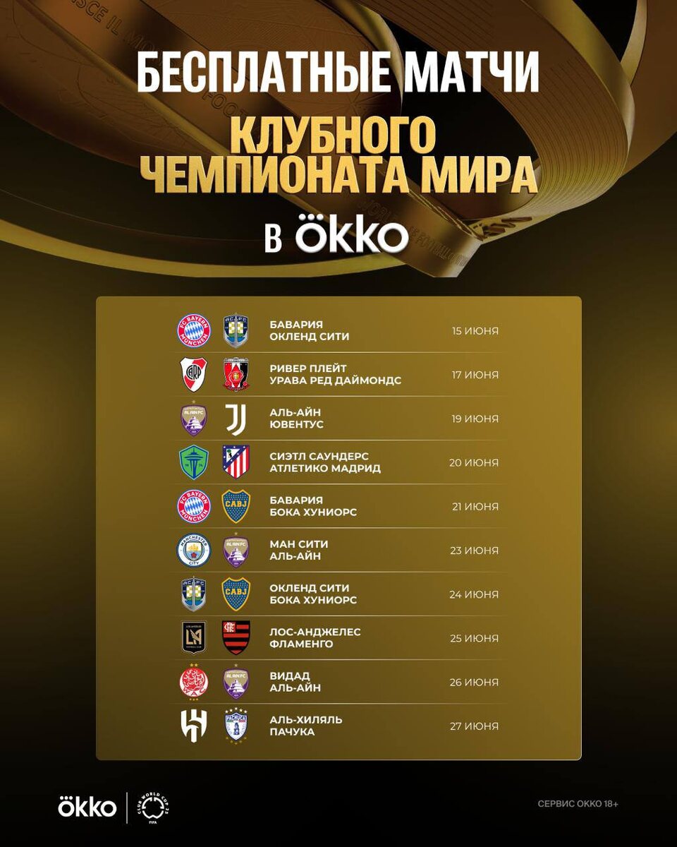 Смотри матчи с участием «Баварии», «Юве», «Атлетико», «Ман Сити» на клубном ЧМ абсолютно бесплатно 🔥 В таком формате мы покажем 10 групповых игр, а также по одной встрече из 1/8 и четвертьфинала. Ничего платить не нужно. Эксклюзивно в Okko. Все бесплатные матчи собраны в нашем специальном разделе. Переходи по ссылке: https://okko.tv/s/ran 🤩