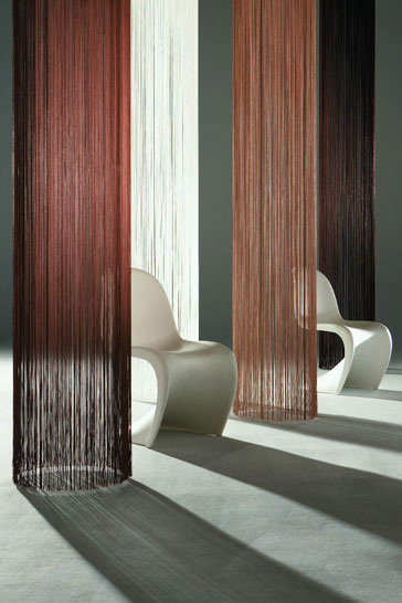 Нитяные шторы в интерьере создают особую праздничную, романтичную или ультрасовременную атмосферу, в не зависимости от того какой вид штор вы выбрали для декорирования – твердые жгуты с деревянными сегментами, прозрачную леску с крупными бусинами, нити с искусственными цветами или перьями, серебристые переливающиеся нити или тонкие однотонные веревки.