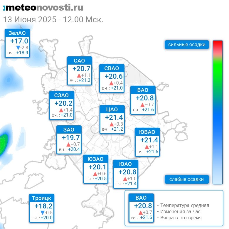 В 12:00 в Москве было от +16.6°C до +23°C, средняя температура +20.4°C #погода #Москва #лето #температура #13июня #пятница