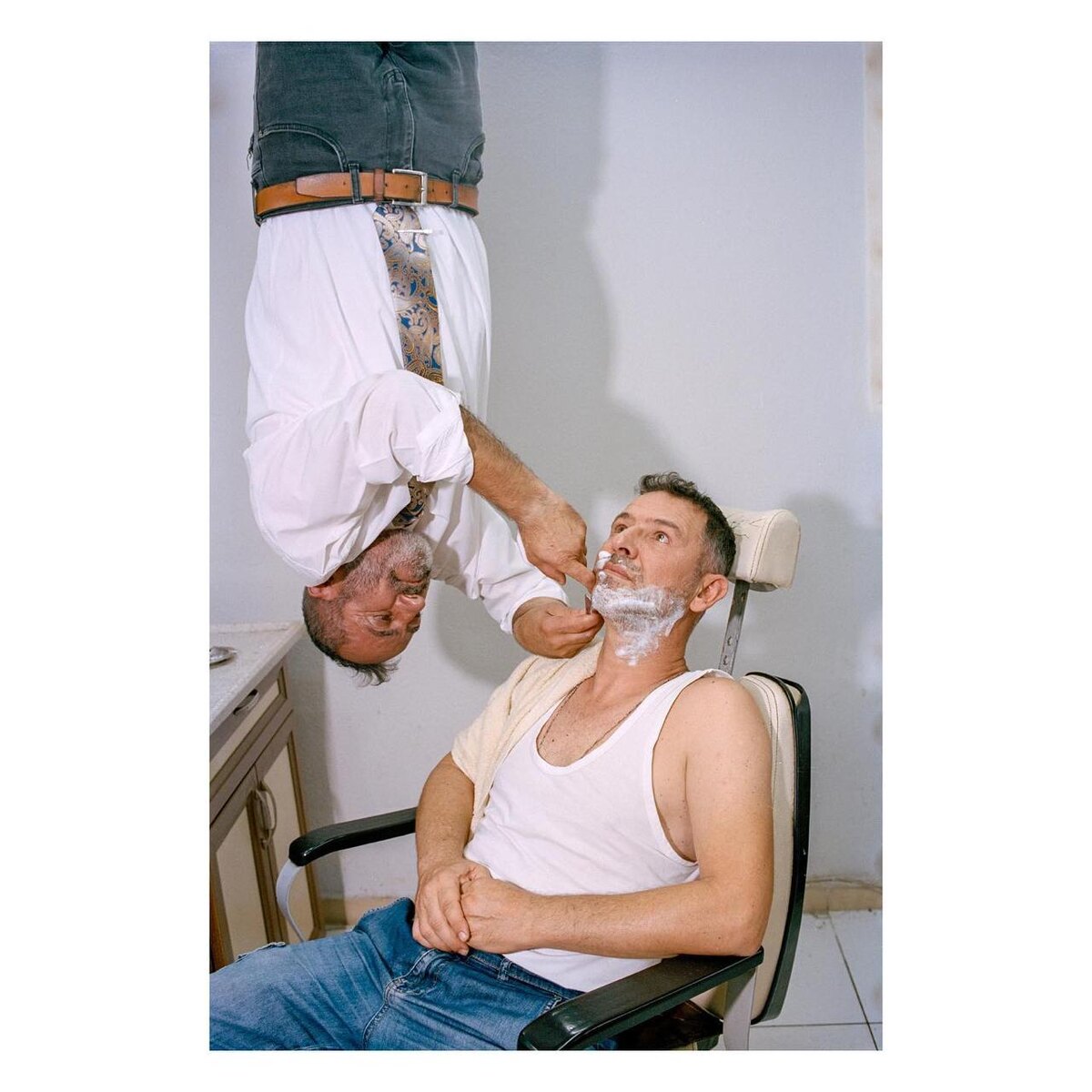 Иса Демир из округа Арифие (Сакарья), недалеко от Стамбула, получил прозвище «Барбер-летучая мышь» за необычный способ стрижки: уже 30 лет он обслуживает клиентов, свесившись вниз головой. В 1995 году, на спор, Иса установил на потолке перекладину для ног и несколько месяцев тренировался, чтобы научиться безопасно работать в таком положении, не испытывая головокружения или дискомфорта. Он достиг впечатляющего мастерства в бритье «вверх ногами». Зачем? Ради зрелищности — согласитесь, такой опыт точно запомнится надолго. Начав до эпохи социальных сетей, Иса всё равно стал известен далеко за пределами Турции. К нему приезжают иностранцы, но основную клиентуру составляют местные жители, которые ценят Демира не только как шоумена, но и как профессионала с уверенной рукой. 📷 Фото: Sabiha Çimen