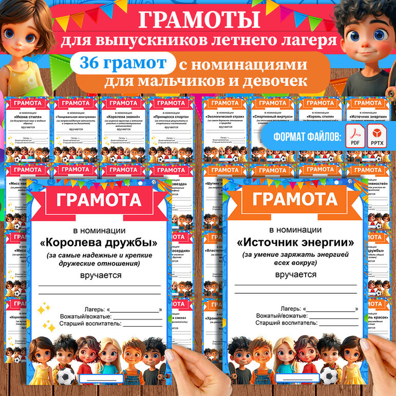 Летний лагерь – это время новых открытий, дружбы и незабываемых приключений. Завершение смены – отличный повод отметить достижения каждого ребенка и подарить им частичку летнего тепла, которое они смогут унести с собой. Именно для этого и создан данный комплект грамот. В комплекте вы найдете 36 грамот с разнообразными весёлыми номинациями, разработанные с особым вниманием к интересам и талантам ребят: 18 грамот предназначены специально для мальчиков, 18 грамот – для девочек. И, конечно же, в комплект входят пустые шаблоны, которые позволят вам создать индивидуальные номинации для каждого ребенка, учитывая их уникальные достижения и особенности. Материал доступен для скачивания в двух форматах: PDF и PPTX (редактируемый). Несколько примеров номинаций для мальчиков (всего 18): Несколько примеров номинаций для мальчиков (всего 18):