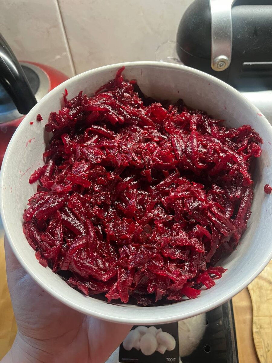 Мне кажется, если в салат добавить солёный огурец — его просто невозможно испортить. У меня, кстати, был рецепт крабового с солёным огурцом, и многие тогда сказали, что это потрясающе. Сегодня мы с родителями собираемся перед нашим отъездом на море и решили приготовить салат к мясу. Как и просили — выкладываю рецепт с пошаговыми фото. Ингредиенты: – варёная свёкла 500 г. – половина головки чеснока (если любите поострее — можно две трети или даже целую) – 4–5 солёных/маринованных огурчиков Свёклу я натираю на тёрке. Лайфхак: делаю это в перчатках — удобно, не царапаешь пальцы и руки потом не нужно отмывать от свекольной краски. Чеснок выдавливаю, огурчики нарезаю. Всё перемешиваю, слегка прижимаю салат ложкой, чтобы ушёл лишний сок и он не получился водянистым. Добавляю майонез по вкусу. Простой, вкусный, почти лёгкий салат — отличный гарнир к мясу и не только 🍷 ❤️ ❤️ ❤️ Забирай подборку >> по ссылке <<, с которой ты перестанешь тратить время у плиты🔥