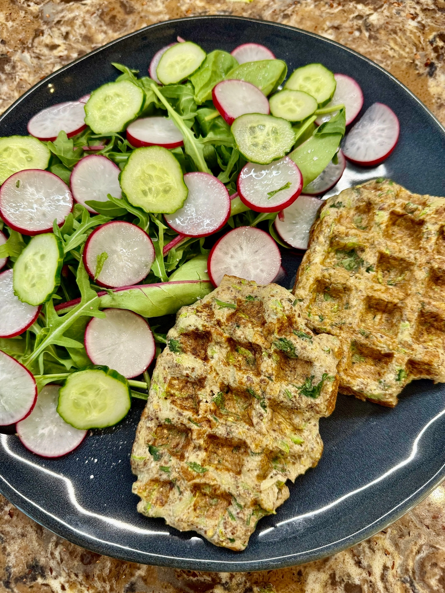 Нежный рецепт ⬇️ Друзья, продолжаю тему нутрициологии и правильного, легкого похудения. На данный момент, я нахожусь в состоянии коррекции веса и придерживаюсь определенной технологии. Одним из главных моментов исключение продуктов с высоким гликимическим индексом. Поэтому с радостью делюсь с вами полезной информацией и вкусным рецептом. 🧇 Нежные кабачковые вафли Рецепт: ✅ Молодые цукини, в них сахара меньше, чем в кабачках. 1шт ✅ Яйцо 1шт, если цукини большой, то 2шт ✅ Чеснок, специи, зелень по вкусу ✅ Чайная ложка тертого пармезана ✅ Орехово-льняная клетчатка 2-3 столовые ложки. 🔹Цукини натереть на крупной терке, посолить, хорошо перемешать, переложить в дуршлаг и оставить на 20 мин. Должен уйти лишний сок. Все ингредиенты смешать и обжарить в вафельнице. Вафли вышли невероятно нежные и вкусные, даже вкуснее обычного рецепта. Клетчатка входящая в состав служит пищей для полезных бактерий в кишечнике, способствуя их росту и развитию. Это улучшает пищеварение и укрепляет иммуни