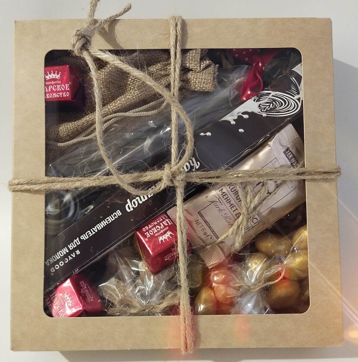 Размышлять о том, что выпало на этот раз приятнее со всякого рода вкусняшками, которые присутствуют в коробке в виде шоколадки, конфет и миндальных орешков с шоколаде.