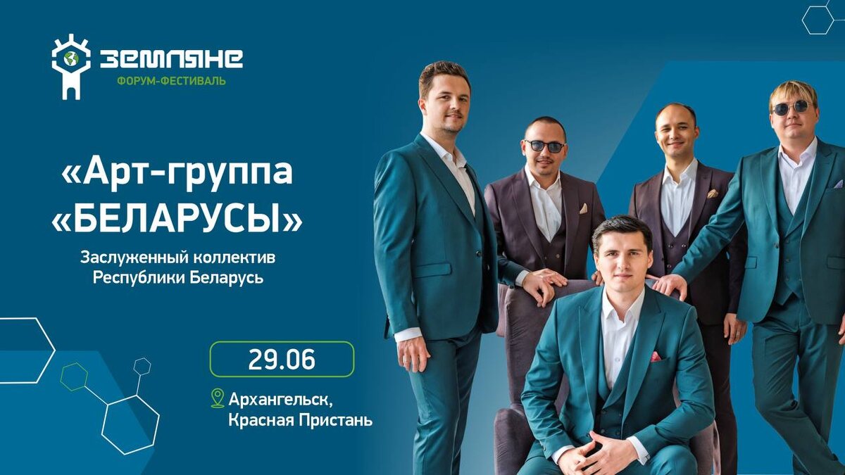 22–29 июня Архангельск примет международный молодёжный экологический форум «Земляне». Его участники – учёные, бизнесмены, политики, медийные лица и студенты 30 ведущих университетов России и стран ближнего зарубежья. Кульминацией форума станет концерт, который пройдёт в рамках северного фестиваля «Белый июнь». Среди тех, кто выйдет на центральную сцену, – один из самых ярких и востребованных коллективов Беларуси – «Арт-группа «Беларусы». Визитная карточка музыкантов из Минска - уникальный стиль, сочетающий академическое мастерство, национальные традиции и современные интерпретации мировых хитов. «Славянский базар», Европейские игры, шоу на Красной площади в Москве – вот уже 20 лет «Арт-группа «Беларусы» покоряет мировые площадки и сердца слушателей. Бессменным руководителем коллектива является композитор, заслуженный артист Республики Беларусь Валерий Шмат, награждённый Указом Президента Республики Беларусь медалью Франциска Скорины за выдающиеся достижения в области культуры. Супруга