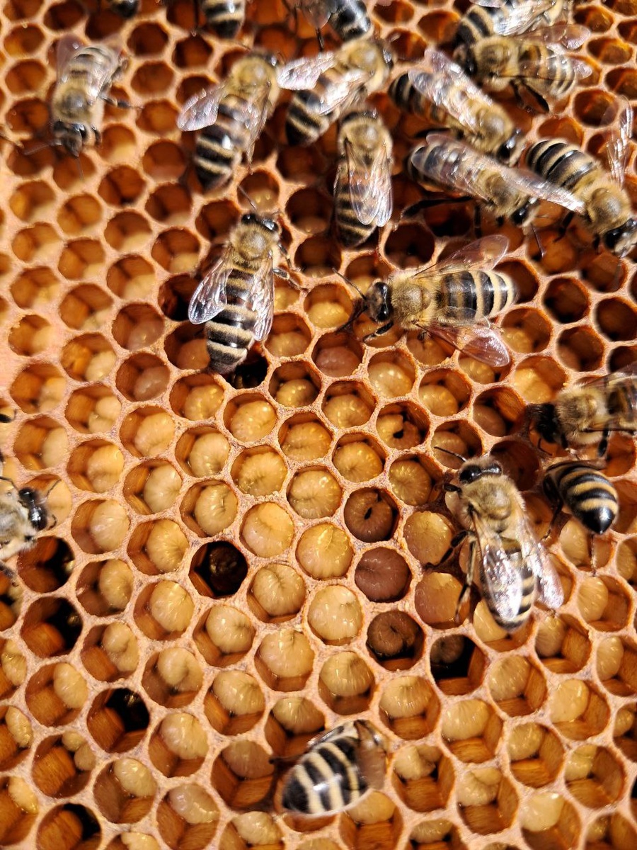 Немного открытого расплода в ленту. Из этих личинок с помощью магии природы родятся пчёлка Понимаю, + страх встретить такое в мёду. Забываем его. Так как рамки для товарного мёда совершенно другие. А это гнездовая и никогда не попадёт в медогонку.