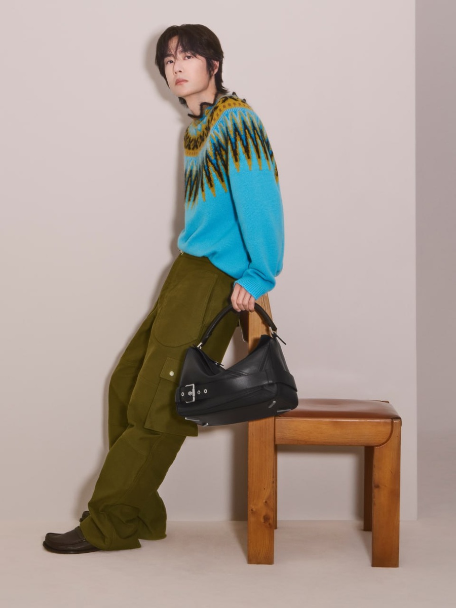 «Глобальный представитель LOEWE Ван Ибо представляет новую сумку Biker Puzzle из чёрной кожи.»