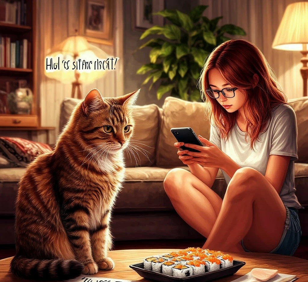 Привет. Я кот. Жил с двумя — с ней и этим… куском недожаренного эго в шортах. Потом он ушёл. А она осталась. И началось... Стадия 1: Отрицание Она сидит, смотрит в телефон, как будто от этого он оживёт. Ждёт, что он напишет: «Прости, я был идиотом». Новость тоже мне! Он не был. Он и есть. Холодильник пуст. Сердце — тоже. Свет в коридоре горит трое суток. Говорит: «Вдруг он зайдёт». Захожу я ...но эффект не то , видимо... Стадия 2: Торги Она начала выставлять сторис, где якобы счастлива. Губы, бокал, свеча, нога в чулке... А потом бежит в ванну реветь. Говорит мне: «Котик, если он вернётся — я всё прощу». Я зевнул. Я бы не простил. Даже если бы он пришёл с килограммом креветок. Надо себя уважать. Стадия 3: Депрессия Теперь...сопли... подушка...плед. Еда? Нет. Только воспоминания. И плейлист «страдание уровня 80» — если включить, у всех кошек в радиусе трёх километров начинается линька. Я ел её печенье. Потому что кто-то должен был есть. Холодильник выглядел так, как будто бывший забра