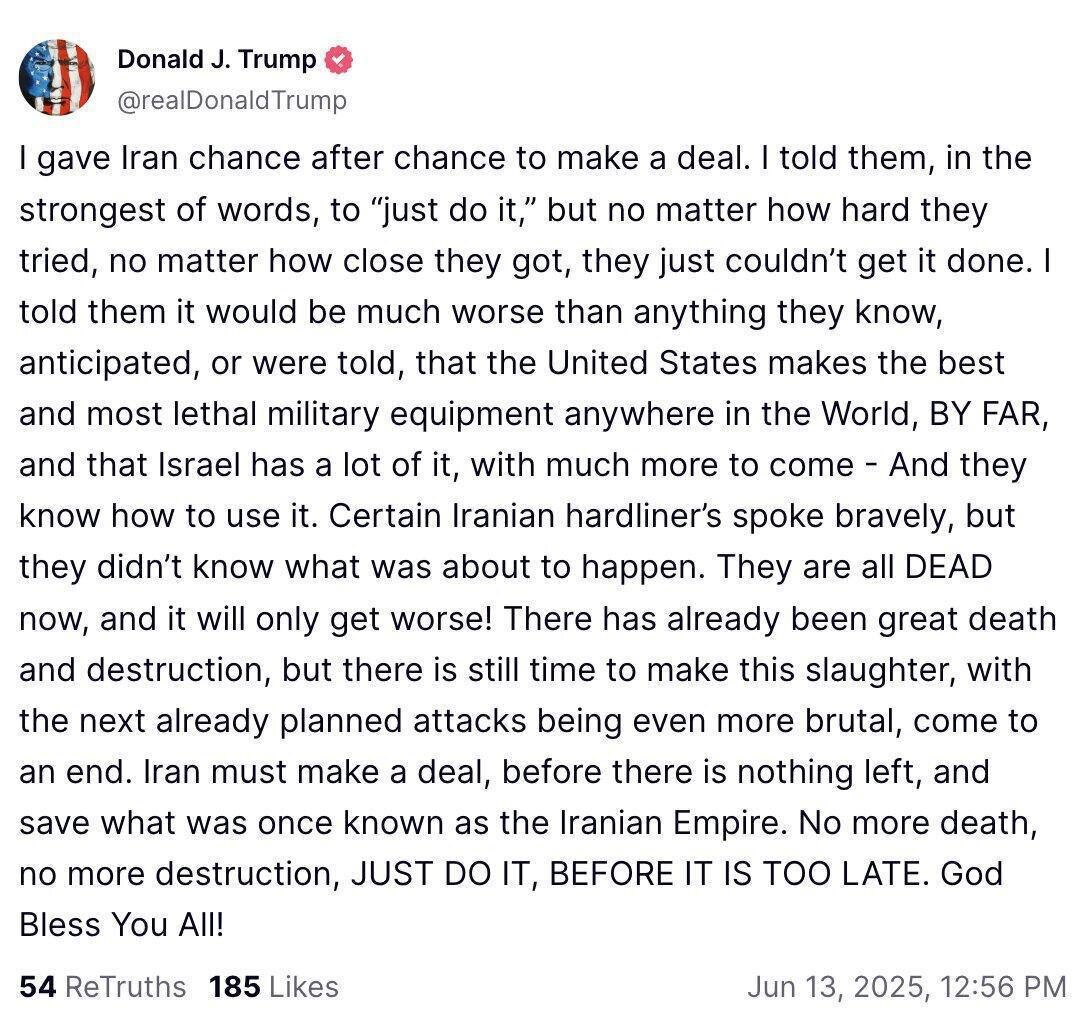 «Иран должен действовать сейчас, чтобы спасти то, что осталось от его империи. Хватит смертей, хватит разрушений. Просто сделайте это, пока не стало слишком поздно», — написал президент США.