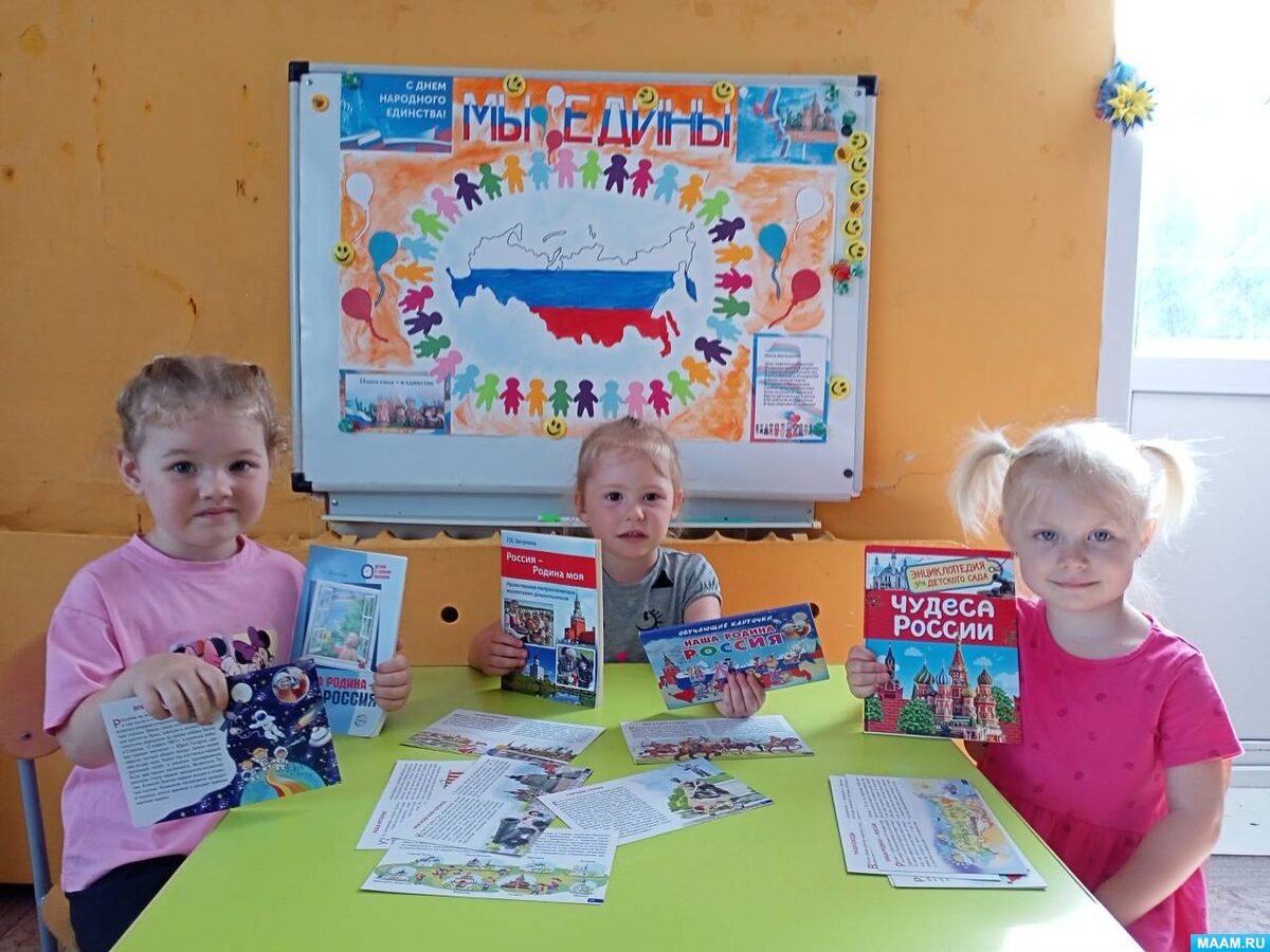 Цель: Воспитание чувства патриотизма к Родине, к её обычаям и традициям. Задачи: 1. Познакомить детей с символами России — флагом и гербом. 2. Расширять представления о народных традициях (игры, хороводы, танцы). 3. Развивать творческие способности детей. 4. Воспитывать любовь к Родине. Оборудование: флаг России и флажки для детей, воздушные шары — белый, синий, красный, матрёшка, глобус, плакат "Мы — едины", кегли, кольцеброс, мыльные пузыри, конструктор, фонограммы песен: "Мы дети твои, Россия", "Матушка земля", "Гимн России". Ход праздника: Воспитатель: Дети, сегодня мы празднуем день рождения нашей страны, которая называется Россия. Россия — это наш общий дом. Он огромный, красивый и очень добрый. Здесь живут разные народы: русские, татары, чуваши, якуты, чеченцы, мордва, башкиры и многие другие. Все они дружат, уважают друг друга, вместе работают, учатся, празднуют. Столица нашей Родины — Москва. А вы знаете, какого цвета флаг России? Дети: Красный, синий, белый. Белый цвет — это