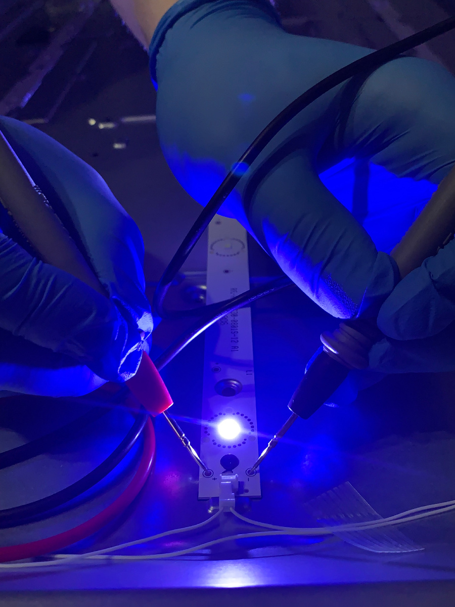 * **Неисправность подсветки (LED-ламп или ленты):** Особенно актуально для современных LED/LCD телевизоров. Могут перегореть отдельные светодиоды (тогда на экране темные пятна или полосы) или выйти из строя драйвер подсветки (тогда экран полностью темный, но звук есть, и при подсветке фонариком можно разглядеть слабое изображение).