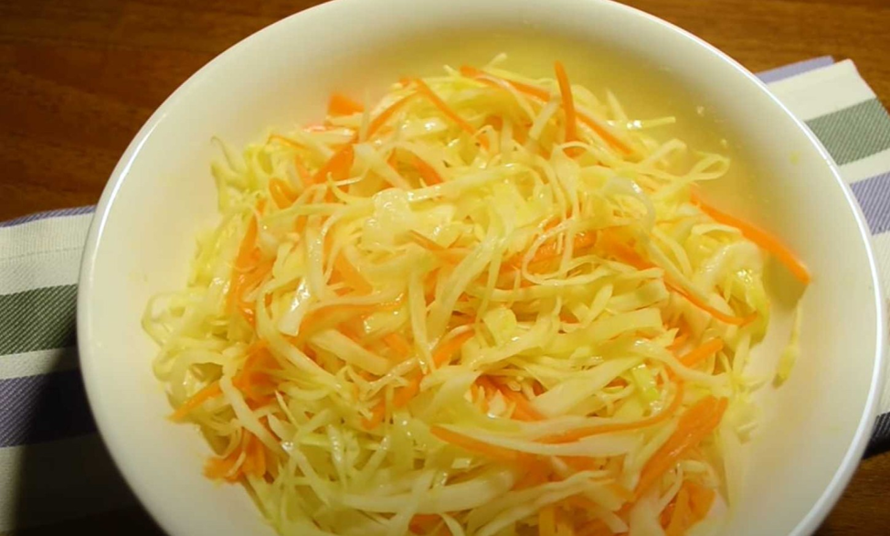 Одним из главных достоинств такого салата является доступность всех ингредиентов и простота приготовления. На три порции для семейного обеда нам потребуются следующие продукты: 1. Мелко нашинкуем капусту. 2. Выкладываем капусту в кастрюлю, добавляем соль, хорошо перемять капусту руками и оставьте на 15 минут. 3. Натираем морковь на крупной терке. 4. Добавляем столовую ложку сахара и две столовые ложки уксуса. 5. Тщательно перемешиваем салат, накрываем крышкой и поставим в холодильник на полтора-два часа. 6. Вынимаем салат из холодильника добавляем две столовые ложки растительного масла и тщательно перемешаем