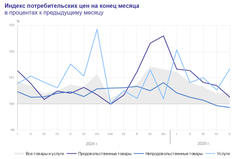 Инфляция в начале июня — темпы инфляции снижаются, но жёсткость ДКП будет продолжена. Майский пересчёт выше из-за подорожания услуг