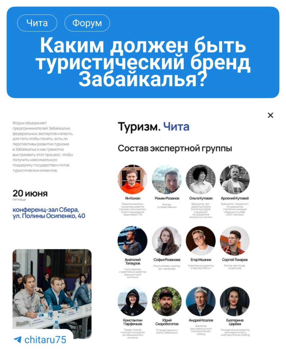 ✅ Первое мероприятие «Форума Сильных» от @chita.ru! Уже 20 июня эксперты встретятся, чтобы выяснить, как привлекать туристов в Забайкалье, каким должен быть туризм в регионе и какие проблемы нужно решить, чтобы сфера начала развиваться. 📌Встреча пройдет 20 июня в 10:00 на Полины Осипенко, 40, в конференц-зале «Сбера». Подробная программа и обязательная регистрация для участия — здесь. Подробности — по ссылке. (16+) 🟦Подписаться | Предложить новость