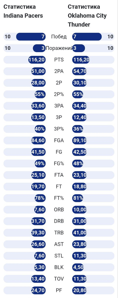 Темп игры (Possession): Индиана играет в чуть более высоком темпе (126.54 владений против 123.66 у Оклахомы). Это означает, что они генерируют больше атакующих возможностей. Если они смогут эффективно использовать эти дополнительные владения, это может компенсировать другие недостатки.