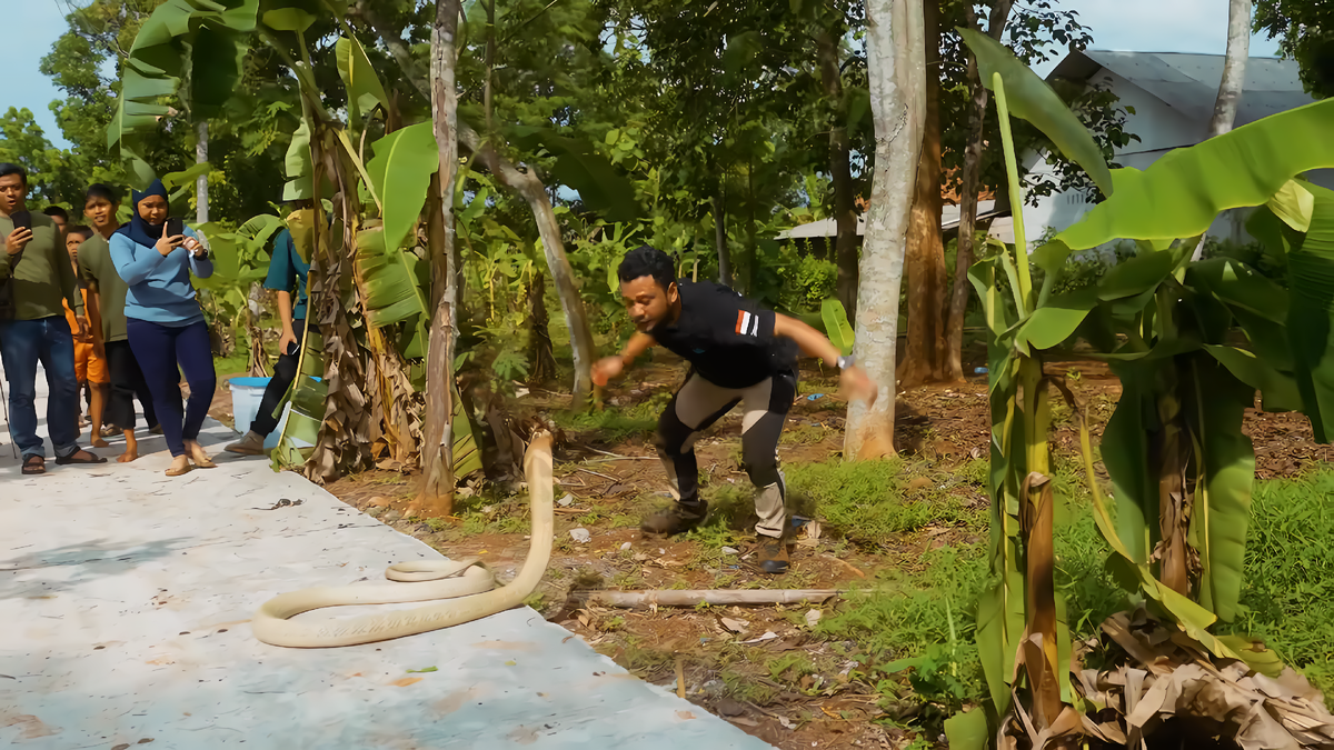 Теперь пришло время искать королевскую кобру в её естественной среде. Панджи дал мне специальную палку для ловли змей. "Ты видел? Я иду-иду! Осторожно", — предупредил я. "Брат, это нормально?" — спросил я, чувствуя, как адреналин зашкаливает. "Да. О боже! Брат, насколько она опасная? Очень опасная. Очень опасная, брат", — ответил Панджи. Просто обычный день в Индонезии. Идёшь — и такое встречаешь. Она входит в пятёрку самых опасных в мире. Мы видели её яд, как он выделяется. Это их среда, поэтому мы её отпустим. Здесь обитают кобры. "Это их дом?" — спросили мы. "Кобра, кобра!" — крикнул Панджи. И вот, наконец, мы поймали кобру! Съемка окончена.