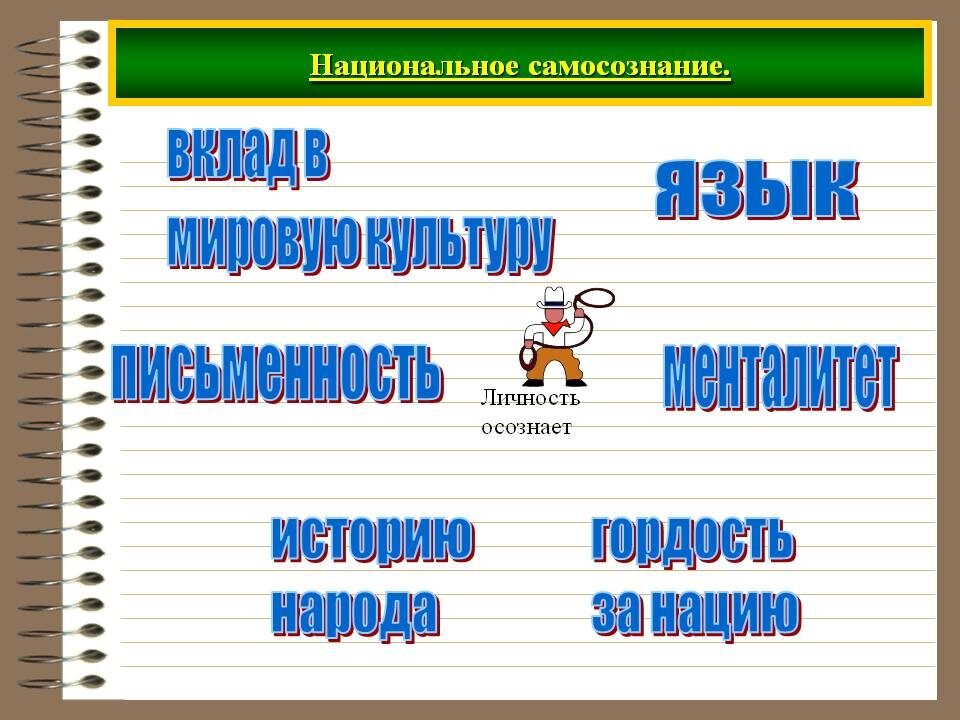 Национальное самосознание является важным фактором, характеризующим нацию как общность и человека как члена этой общности.Личность, полагая себя неотделимой частицей нации, осознает историю своего народа, общественно-национальные ценности, такие, как письменность, национальный язык, разнообразные достижения в духовной культуре, национальный менталитет, ценит вклад народа в мировую культуру, разделяет успехи нации и способствует ее развитию. Таким образом, национальное самосознание базируется на исторической памяти, знании истории, традиций своего рода. Оно включает в себя также эмоционально-ценностную оценку прошлого своей нации, ее современного состояния, ее взаимосвязей с другими народами. Все это обогащает духовный мир личности, создает определенную психологическую установку на цели и направленность деятельности. Центральным компонентом национального сознания является национальное самосознание – совокупность представлений, традиций и понятий представителей нации или этноса, позволяю