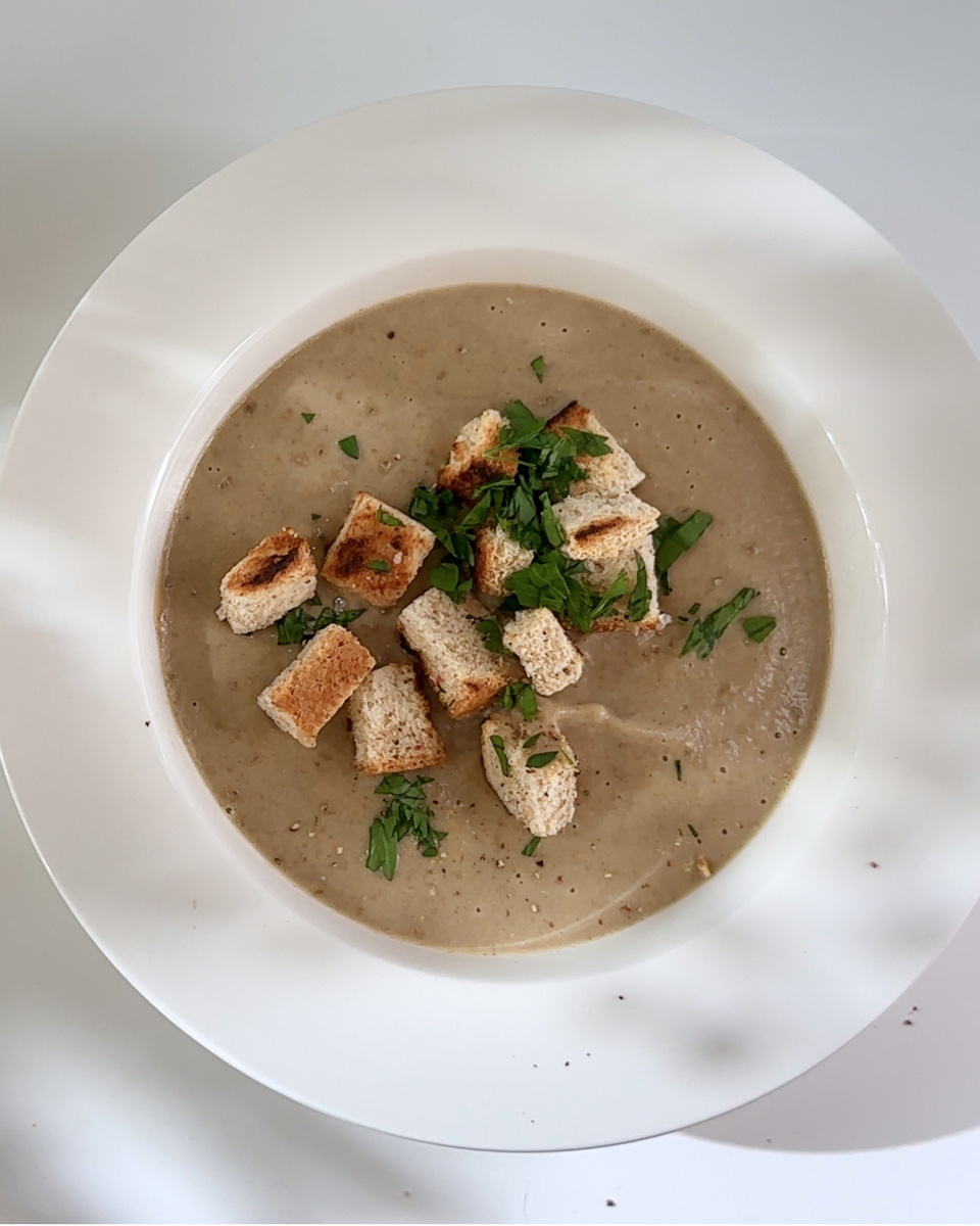Делим на порции, добавляем сухарики, зелень. Я добавляю немного свежесмолотого перца и свежесмолотой крупный соли.