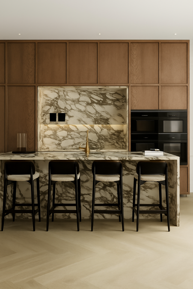 Когда заказчик показывает нам визуализацию от дизайнера, чаще всего за этим стоит простое ожидание: «хочу, как на картинке». Но на деле каждый рендер скрывает десятки технических решений, без которых реализация либо невозможна, либо приведёт к конфликту между ожиданиями и реальностью. Мы работаем с такими задачами ежедневно. Ниже — несколько ситуаций, с которыми сталкивается производитель мебели, если он действительно пытается реализовать проект, а не просто «сделать что-то похожее». На визуализации — кухня в шпоне, фасады будто бы оформлены тонкой рамкой. Но при внимательном рассмотрении становится ясно: это не рамка на самом фасаде, а скорее проставка между фасадами, формирующая сетку. А сами фасады — вкладные, утопленные внутрь этой сетки. Если воспринять картинку буквально и изготовить фасады с накладной рамкой, получится изделие с другим визуальным ритмом: рамка станет толще, зазоры уже не будут такими аккуратными, и восприятие всей композиции изменится. Клиенту это может показать