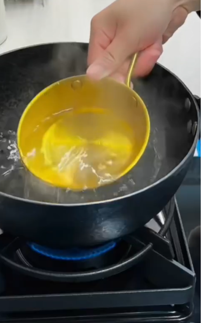 В миску разбейте яйца, влейте кипяток и быстро тщательно перемешайте.
