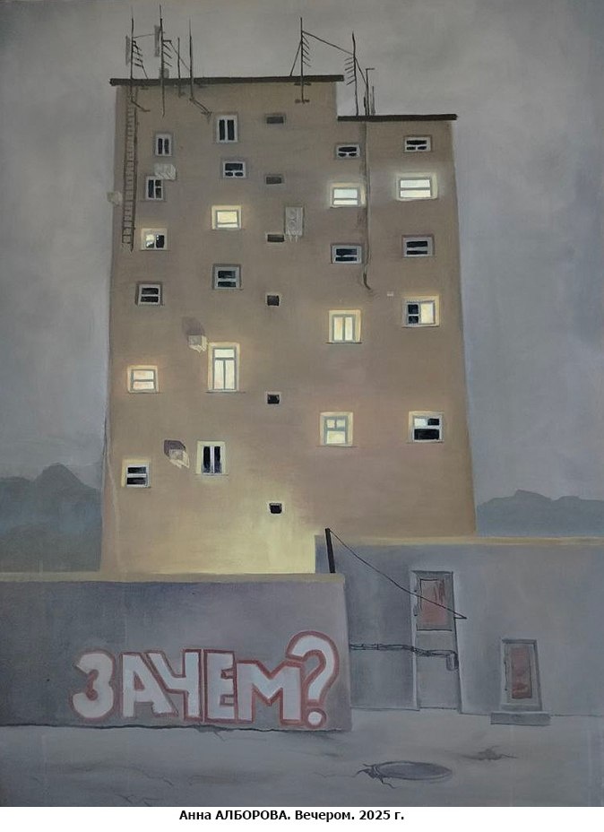 На проходящей сейчас выставке «Владикавказ глазами художников» представлены очень достойные живописные полотна и графика. Меня особо привлекли две работы Анны Алборовой. Одну из них она вообще оставила без названия, но картина говорит и так весьма громко.