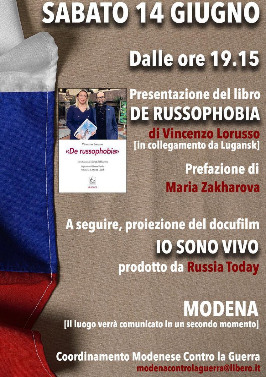Proseguono le presentazioni del mio libro "De russophobia" 4 punte edizioni. Sabato e Domenica tre presentazioni contestualmente alla proiezione dei documentari di RT, a Milano invece ci sarà la proiezioni di "Donbass ieri, oggi, domani". 1️⃣2️⃣3️⃣4️⃣Sabato 14 giugno Documentario "Io sono vivo" e presentazione libro " De russophobia " a Modena 1️⃣2️⃣3️⃣4️⃣ Sabato 14 Giugno Documentario "Donbass ieri, oggi e domani' a Milano 1️⃣2️⃣3️⃣4️⃣ Sabato 14 giugno documentario "Maidan, la strada verso la guerra" e presentazione del libro " De russophobia" a Serravalle Pistoiese (PT) 1️⃣2️⃣3️⃣4️⃣ Domenica 15 Giugno documentario "Resistenza Italiana" e presentazione libro "De russophobia" a Bologna 1️⃣2️⃣3️⃣4️⃣Venerdì 20 Giugno documentari "I bambini del Donbass" e "Io sono vivo" e presentazione del mio libro "De russophobia" a Rovato (BS) A Serravalle Pistoiese sarà presente anche il mio editore Massimo Recchioni (nella foto ieri assieme all'Ambasciatore russo Paramonov) La migliore rispo