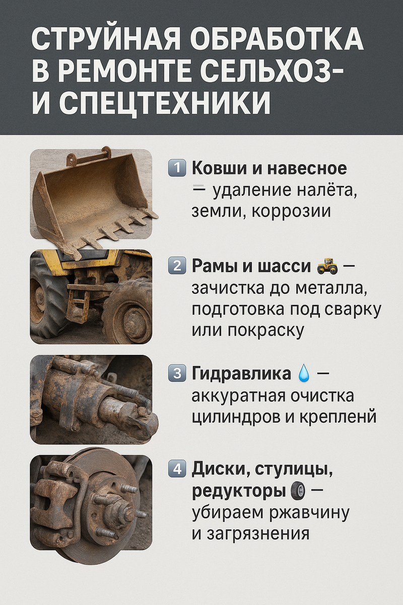 Струйная обработка в ремонте сельхоз- и спецтехники 🚛 Когда техника работает в тяжёлых условиях — поля, стройка, карьеры — детали изнашиваются быстро. 🔧 И многие бросают их в угол со словами: “да это уже не спасти”. А зря! Вот, что можно вернуть к жизни с помощью струйной обработки: 1️⃣ Ковши и навесное ⚙ — удаление налёта, земли, коррозии 2️⃣ Рамы и шасси 🚜 — зачистка до металла, подготовка под сварку или покраску 3️⃣ Гидравлика 💧 — аккуратная очистка цилиндров и креплений 4️⃣ Диски, ступицы, редукторы 🛞 — убираем ржавчину и загрязнения 5️⃣ Топливные баки и патрубки 🛢 — чистим без разбора 📌 Часто оказывается, что “ржавый кусок” — это вполне живая деталь, которой просто нужна правильная обработка. Подписывайтесь на наши социальные сети, где вы найдете актуальные новости, полезные советы и эксклюзивные предложения 🎁 ☎️Наш номер: 8-996-613-32-22 ⚖️Наш сайт: https://steelsand.ru/ 🔥 Наш Телеграм: https://dzen.ru/id/67ed3d54cb64af7ca2e8ad09 ➡️Наш Инстаграм: https://www.instag