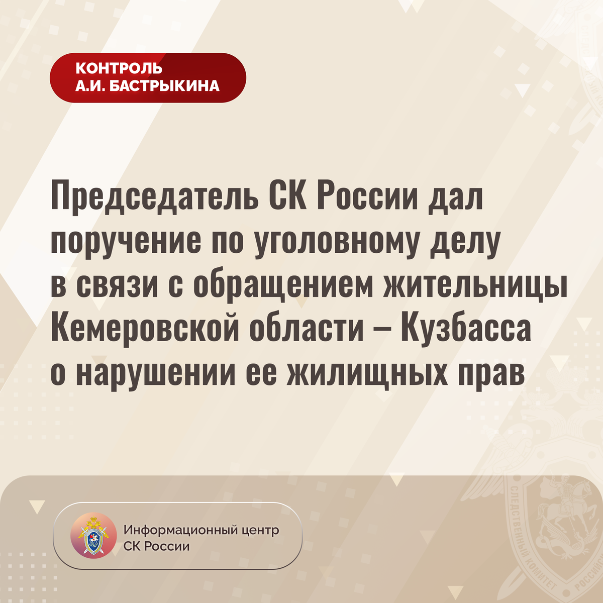 Председатель СК России дал поручение по уголовному делу в связи с обращением жительницы Кемеровской области – Кузбасса
