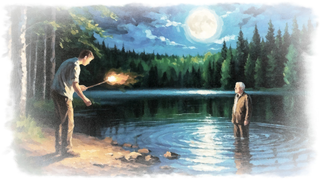 "Когда луна поднялась над водой, он вошёл в озеро по колено и начал чертить на поверхности что-то пальцем. Вода... реагировала. Расходилась кругами, хотя ветра не было. Потом он достал фотографию Маши и положил её на воду. И тогда..."