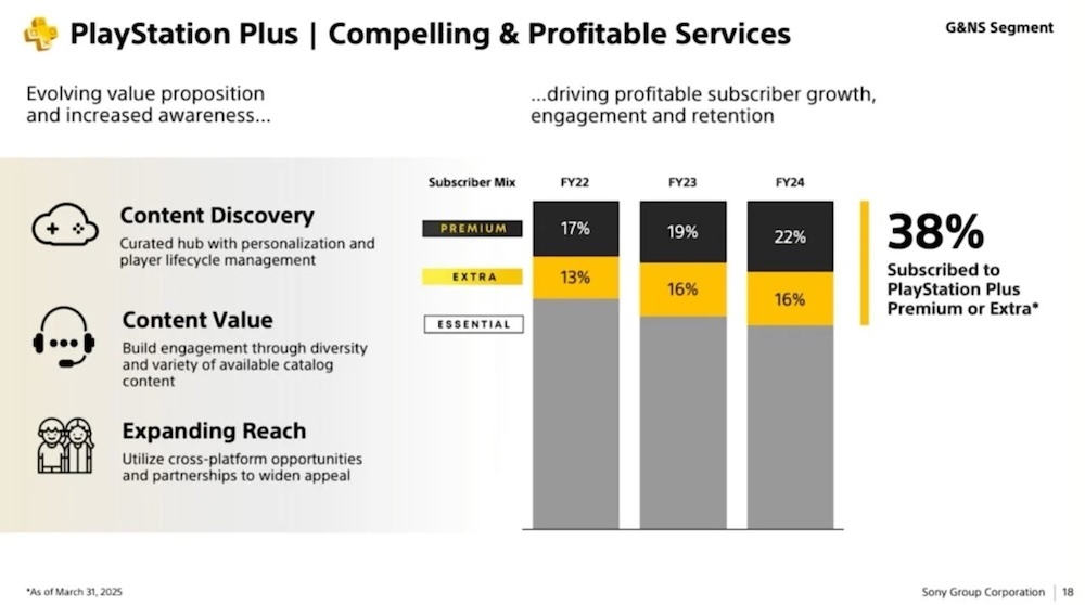 Sony Interactive Entertainment продолжит корректировать ценовую политику PlayStation Plus, опираясь на статистику о предпочтениях пользователей. Несмотря на недавние повышения стоимости, всё больше игроков выбирают расширенные тарифные планы. По данным, представленным на последней бизнес-встрече компании, процент подписчиков PlayStation Plus, выбирающих тарифы Premium и Extra, стабильно растет с 2022 финансового года. Пользователи всё чаще предпочитают наши тарифы Premium и Extra, которые сейчас составляют примерно 38% от общего числа подписчиков.Президент и генеральный директор SIE Хидеаки Нисино Статистика подтверждает этот тренд: если в 2022 финансовом году на тариф Premium приходилось 17% подписчиков PS Plus, а на Extra – 13%, то к 2024 финансовому году эти показатели выросли до 22% и 16% соответственно. В видеоинтервью, опубликованном вместе с презентацией, Нисино подробнее объяснил ситуацию с повышением абонентской платы: PlayStation Plus высоко ценится нашими игроками и продолжа