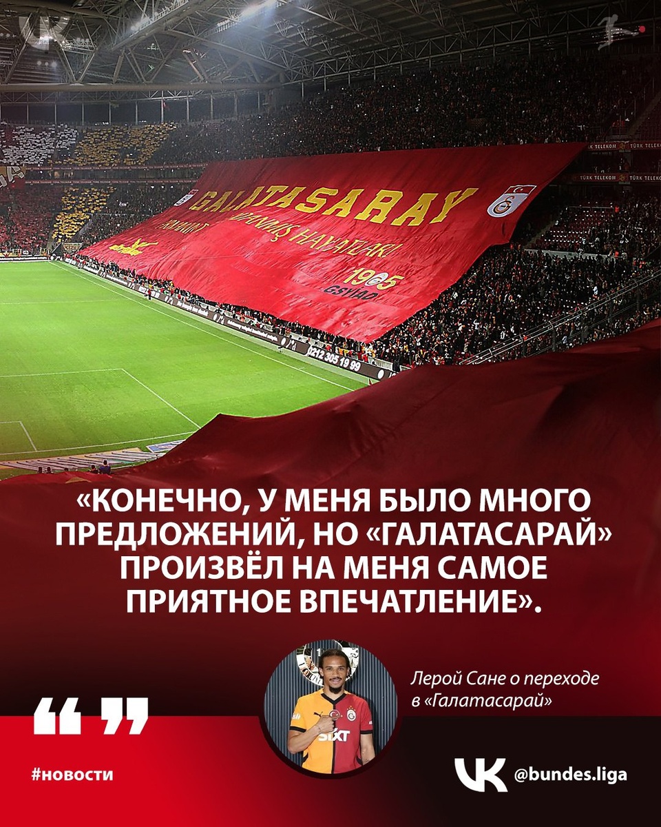 ☺ «Атмосфера меня очень впечатлила», - Лерой Сане прокомментировал переход в «Галатасарай». 💬 «На стадионе была очень шумная обстановка. Конечно, это оказало значительное влияние на моё решение. Я с нетерпением жду своей первой игры перед болельщиками «Галатасарая». ⚡Конечно, у меня было много предложений, но «Галатасарай» произвёл на меня самое приятное впечатление. И атмосфера, и величие клуба, их желание получить меня, интерес, который они проявляли ко мне, оказали большое влияние на моё решение. Поэтому я с уверенностью принял решение перейти в «Галатасарай», — приводит слова Зане официальный сайт жёлто-красных.