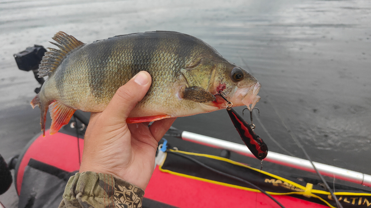 Сегодня получился невероятно атмосферный рыболовный день. Решил не гнаться за дальними кордонами и выбрался на Волгу в районе лесобиржи — знакомые места, но они всегда могут удивить. С утра мелкий дождик тихонько моросил, небо затянуто — настоящая волжская романтика, но недолго: чуть позже поднимется ветер и выглянет жаркое солнце. Оказавшись рядом с островом, не выдержал — взял поппер и первым же забросом получил поклёвку. Окунь, конечно, бодро схватил, но сошёл прямо у лодки. В душе даже порадовался: с первого заброса рыбу ловить — плохая примета. Кидаю ещё раз — поппер LureMax по имени JOKER чавкает по самой траве, появляется мощный вихрь, удар — и вот он, красавец окунь на 600 грамм! Думаю, вот сейчас-то и пойдёт клёв... Но река решила иначе: больше ни одной поклёвки в этом месте так и не увидели. Ладно, смещаемся ближе к глубине — на 11 метров. Здесь уже работает тяжёлая артиллерия — тейл-спиннер UF-Studio, 21 грамм. Первый же заброс: приманка ложится на дно — и сразу поклёвка! Пр