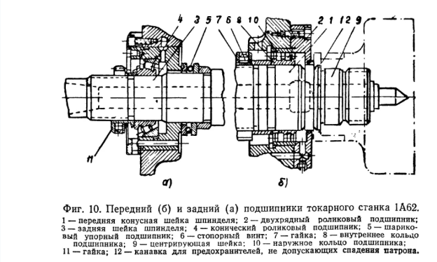 Перейдем к шпинделю. Передняя конусная шейка шпинделя станка ДИП-200 вращается в бронзовом подшипнике с коническим отверстием. Задняя шейка — в коническом роликовом подшипнике. При сверлении и подачах резца в сторону передней бабки на шпиндель действует осевая сила (направленная вдоль оси). Ее воспринимает шариковый упорный подшипник, находящийся у заднего подшипника шпинделя. Токарь должен знать, как отрегулировать передний подшипник шпинделя при его износе. Сначала надо ослабить заднюю гайку, находящуюся с левой стороны подшипника, потом повертыванием передней гайки, находящейся справа, подтянуть конусную бронзовую втулку. Слабины быть не должно, но и слишком сильная затяжка недопустима. Для проверки надо выключить перебор (рукоятка В) и посмотреть,— легко ли идет шпиндель при повертывании его вручную за шестерню. Потом затянуть заднюю гайку. В хорошо отрегулированных подшипниках шпиндель должен вращаться спокойно, без биения, а сами подшипники не должны перегреваться. С
