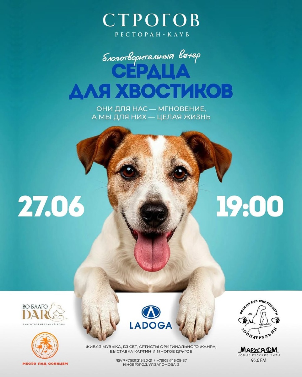 Благотворительный вечер «Сердца для ХВОСТИКОВ» 27 июня в ресторане Строгов в 19:00 пройдёт особенное мероприятие, посвящённое помощи бездомным животным. Организаторы - «ЗООПАТРУЛЬ НН» и «Во Благо Дар». Выступления артистов оригинального жанра, выставка картин, аукцион, винное казино. Заломова, 2 #яместный