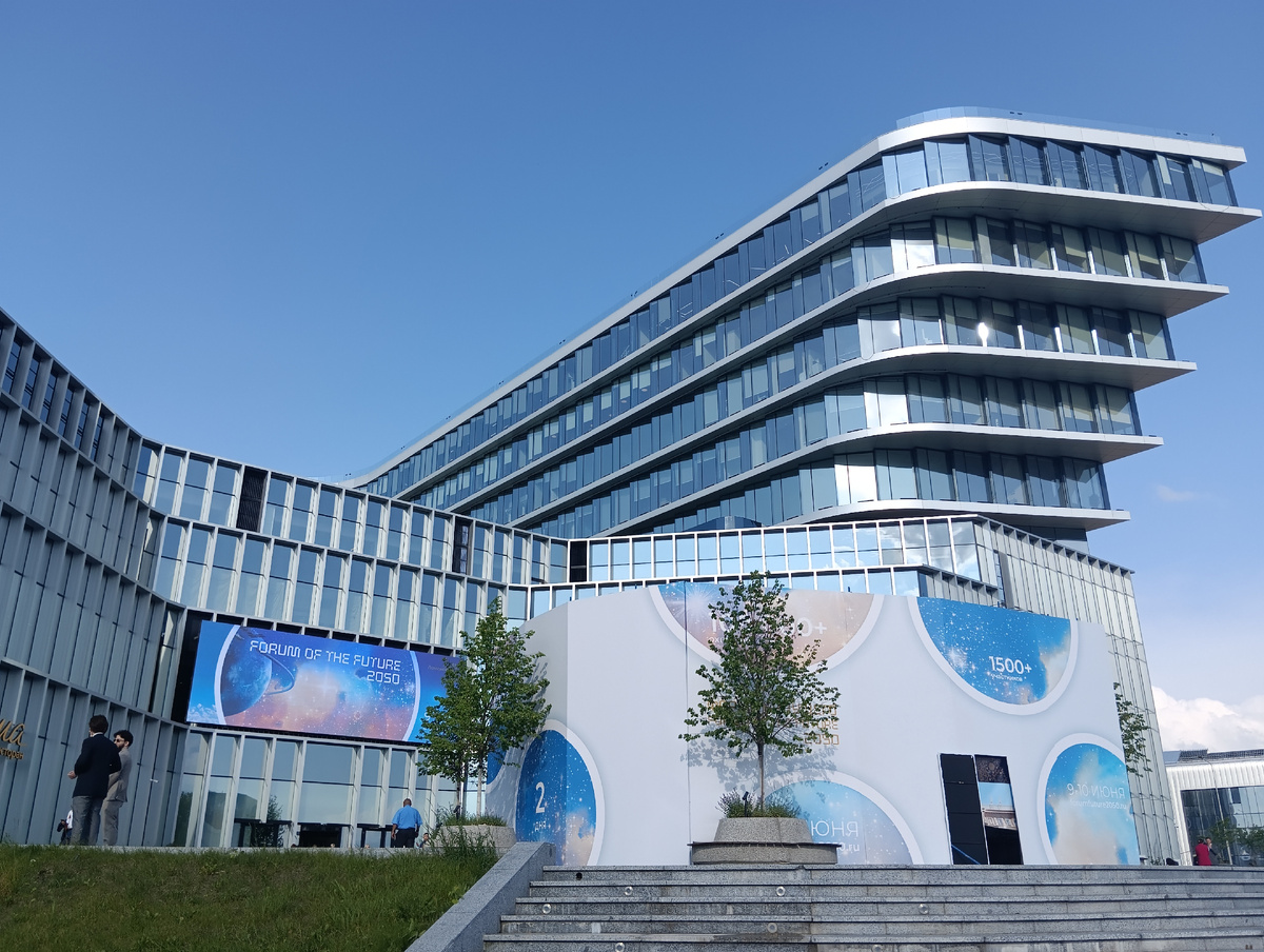 Сверкающий на июньском солнце футуристическими формами новый образовательный кластер «Ломоносов», выглядел, как многоярусный людской муравейник.
