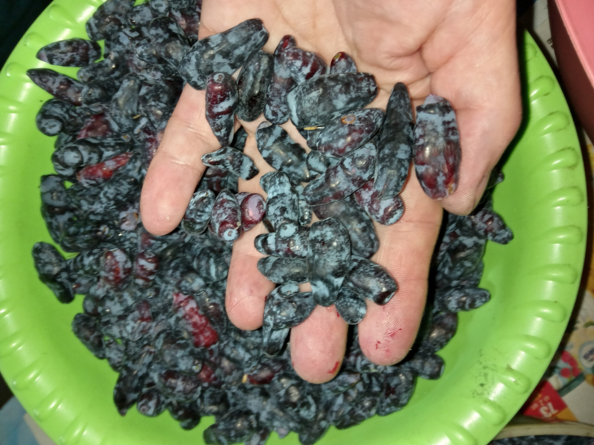 Новости с полей какие-то подозрительные были: Новосибирск собирает землянику садовую (клубнику). (У меня там родня.) Эй, ребята, не рано ли!? Это дело у нас к концу июня случается только, а до этого у нас жимолость, только и ей еще рано. И зачем я пошла в огород? Сидела бы, статью написала обещанную, не лежала бы сейчас пластом. Ан, нет, понесла меня нелегкая глянуть на зеленые ягоды жимолости. Глянула... Прихожу домой: "Там ВСЕ СИНЕЕ! Таз, накомарник мне. Термос с кофе и бутерброды!" Ну, последнее было шуткой, но несколько часов под кустами мне были обеспечены и это только начало. Так и изменились все планы, так и сижу теперь, как моряк, вся просоленная (+26" в тени) и с СИНИМ языком. Перебирать пришлось срочно, ягода перегретая, тёпленькая, вкусная! Три кило для первого сбора, а за ним еще пара недель "приятного времяпровождения" вокруг и около, под и над кустами жимолости. А если земляника садовая (клубника) жимолось догонит, то очень вкусная получается в варенье смесь. С вами кан