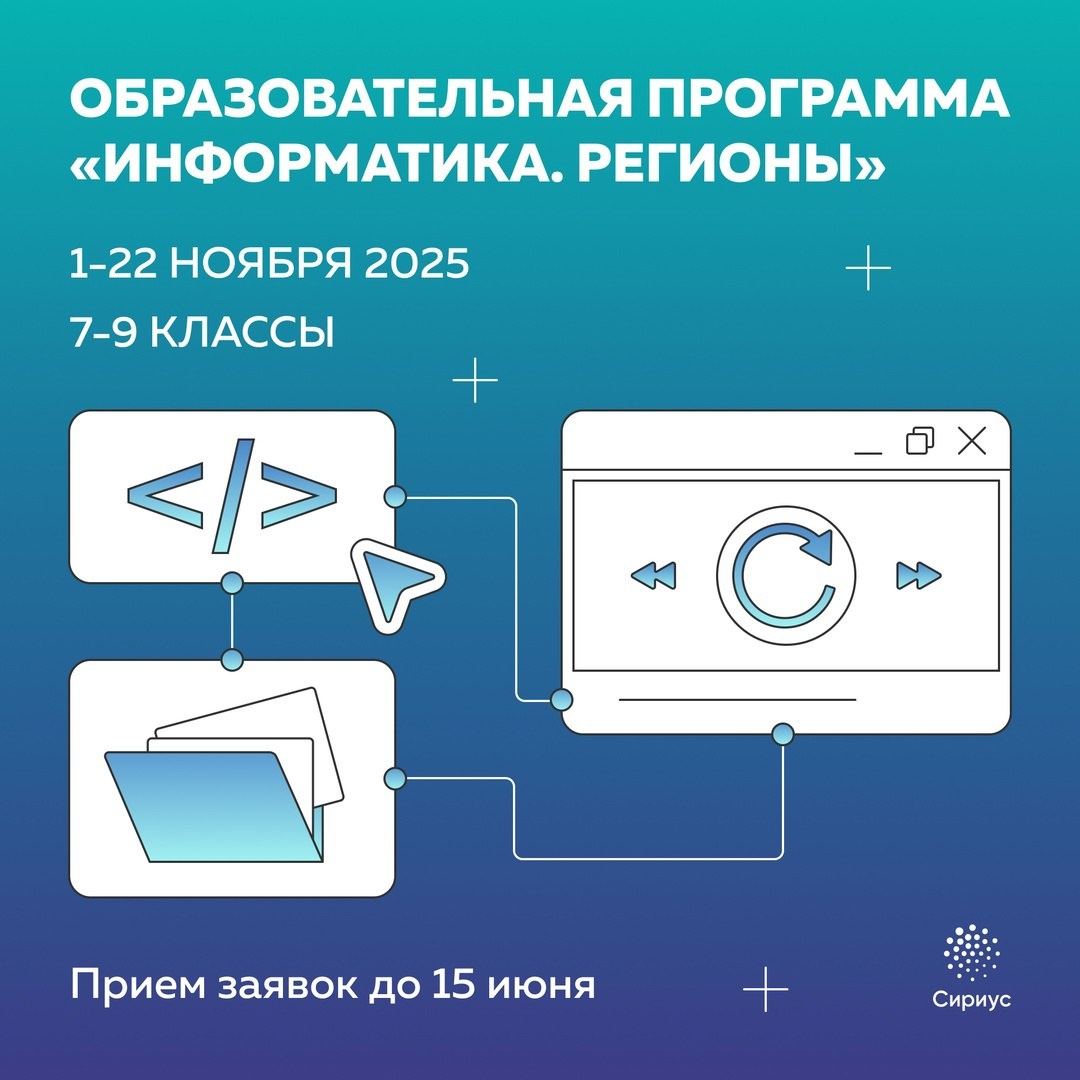 ⚡️ В Сочи на три ноябрьские недели — поехали! Образовательная программа «Информатика. Регионы» пройдёт с 1 по 22 ноября для учащихся 7-9 классов в ОЦ «Сириус» Отбор участников будет суровым: три этапа. ✅ дистанционный учебно-отборочный курс на платформе «Сириус. Курсы» с 13 мая по 27 августа ✅ дистанционное тестирование 30 августа ✅ заключительный отборочный тур (проводится в регионах 13 сентября) 📌 Образовательная программа состоит из двух образовательных ступеней: «Алгоритмы и структуры данных-1» и «Алгоритмы и структуры данных-2». ✅ лекции ✅ индивидуальные обсуждения решений задач с преподавателем ✅ консультации ✅ самостоятельные решения задач ✅ соревнования, игры и даже индивидуальные олимпиады ✅ встречи с учёными и партнерами «Сириуса» ✅ итоговые зачёты Приём заявок до 15 июня, торопитесь! 🔗 vk.cc/cMzktL