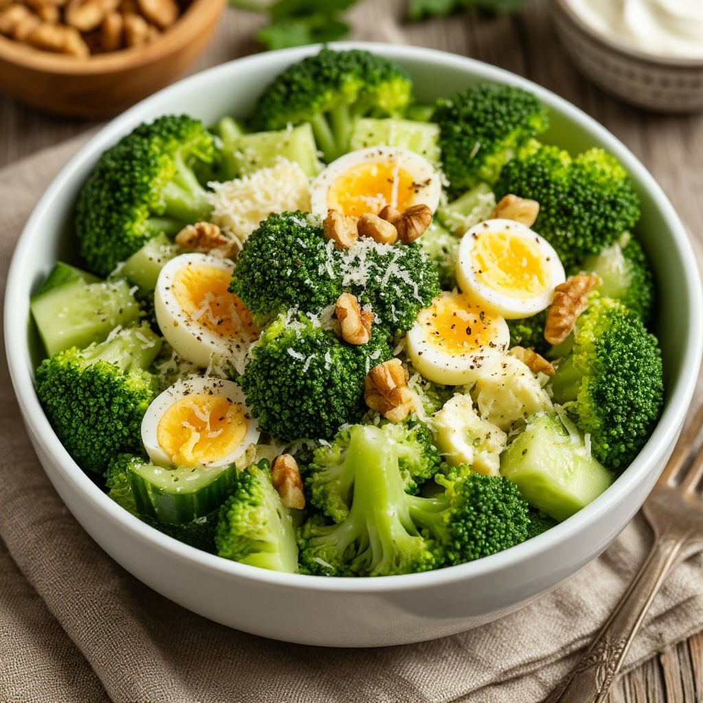 Салат с брокколи – это настоящая находка для тех, кто хочет порадовать себя чем-то вкусным и при этом полезным. Брокколи – главный герой этого блюда. Она не только добавляет яркий цвет и отличные вкусовые качества, но и содержит целый набор полезных веществ. Этот овощ полон витаминов, минералов и антиоксидантов, поэтому он отлично подходит для поддержания здоровья и укрепления иммунной системы. Давайте разберемся, как же приготовить этот замечательный салат и что для этого понадобится. Для начала вам понадобятся следующие ингредиенты: - 600 г брокколи - свежие соцветия, которые и станут основой нашего салата - 2 больших огурца, которые придадут свежесть и хрустящую текстуру - 5 яиц -добавят белка и сделают салат более сытным, они также являются источником витаминов группы B и полезных жиров - 70 г сыра - можете выбрать тот, что больше нравится, отлично подойдёт фета или пармезан - 100 г грецких орехов - эти орехи полезны для сердечно-сосудистой системы благодаря омега-3 жирным кисло