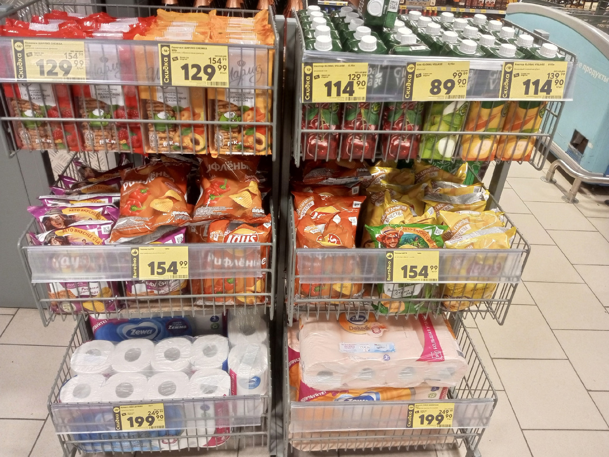 Из продуктов же собрана в основном ерунда; то, что часто критикуют и не покупают каждый день. Неплохое по вкусу печенье с фруктовым джемом - 129 рублей, разные вкусы чипсов "Lays" за 154. Действительно низкая цена предложена разве что на один из видов сока, яблочный стоит 89 рублей, в то время как все остальные по 114. И такая стоимость в последнее время редкость, стоит обратить внимание.