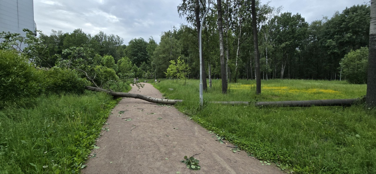 В парке у метро Дыбенко на тропу упало огромное дерево от ветра, чудом никого не убило