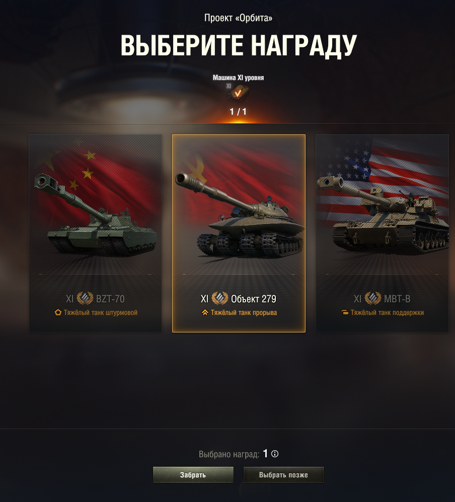 Чтобы получить танки 11-го уровня, необходимо пройти через проект «Орбита». В рамках проекта доступно 10 этапов, за успешное прохождение которых можно получить два танка 11-го уровня, а также по одному танку 8-го, 9-го и 10-го уровней.