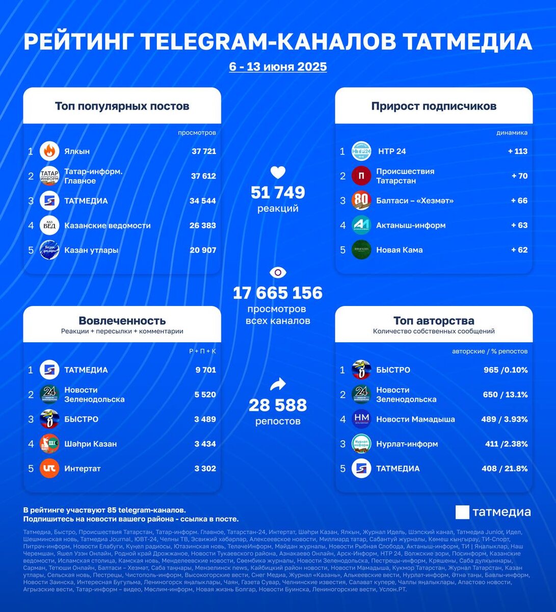 В ответ на пост 🕵🏻♂️📱Обзор вовлеченности в каналах Татмедиа | 6-13 июня Каналы с наибольшим числом просмотров: 1. ТАТМЕДИА - 2 055 636 2. Новости Зеленодольска - 1 190 587 3. БЫСТРО - 978 084 4. Интертат - 734 020 5. Новости Мамадыша - 729 389 Посты с наибольшим числом просмотров: 37 721 🔹 ЯЛКЫН: «Татарстан-Мордовия» форумында Республикабыз Рәисе Рөстәм Миңнехановка яшүсмерләр бик күп кызыклы сораулар бирделәр. 37 612 🔹 Татар-информ. Главное: Информационное агентство «Татар-информ» празднует 35-летие. 34 544 🔹 ТАТМЕДИА: В серии «Библиотека «Казан утлары» вышла 29-я книга – «На шаг опережая смерть». 26 383 🔹 Казанские ведомости: В Казани проходит III Международный форум министров образования «Формируя будущее». 20 907 🔹 Казан утлары: «Казан утлары» журналы китапханәсендә 29 нчы кесә китабы басылып чыкты. 12 057 🔹 Происшествия Татарстан: Глава Елабужского района сообщил о сбитом БПЛА. 7 715 🔹 БЫСТРО: Четыре украинских беспилотника сбиты сегодня рано утром над Татарст